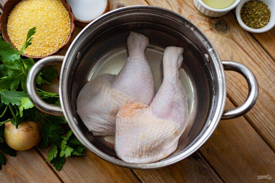 Добавьте кукурузную крупу в кастрюлю к окорочкам и варите 30 минут.