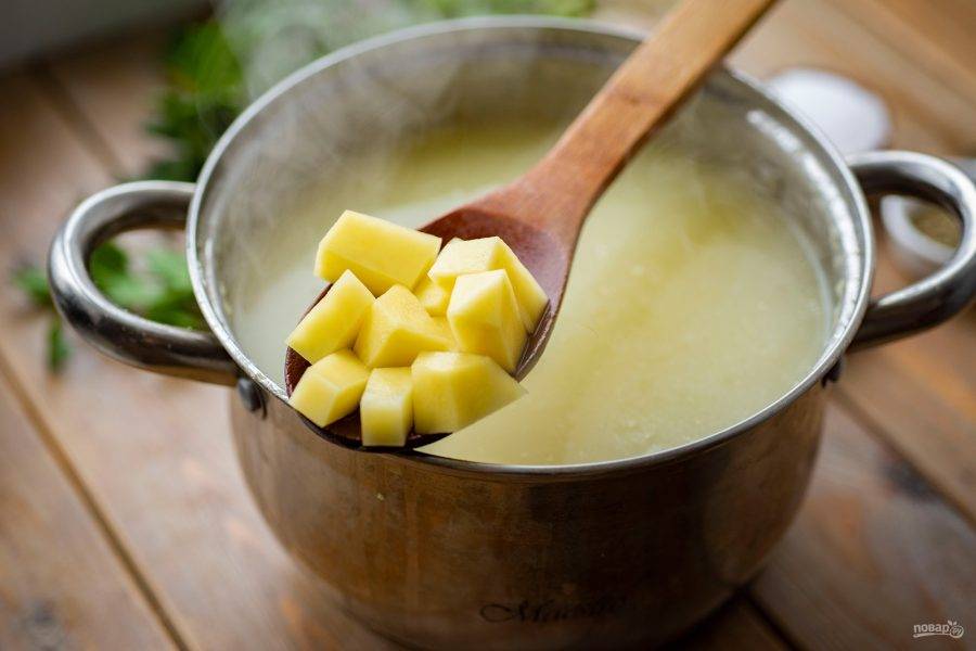 Добавьте картофель в кастрюлю и продолжайте варить все вместе еще 10 минут.