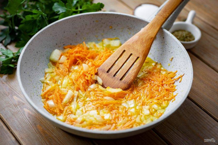 В сковороде разогрейте растительное масло и выложите измельченные морковь и лук. Обжаривайте на небольшом огне до мягкости овощей.