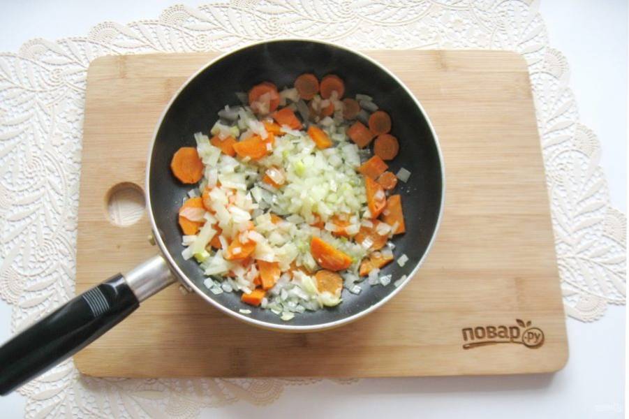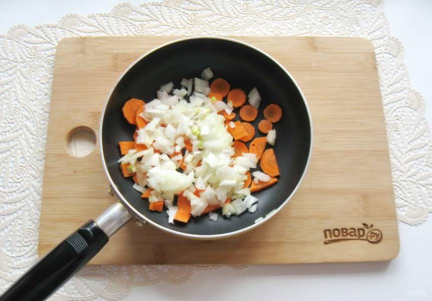 Одну луковицу и морковь очистите, помойте и мелко нарежьте. Выложите в сковороду с рафинированным подсолнечным маслом.