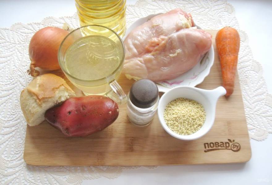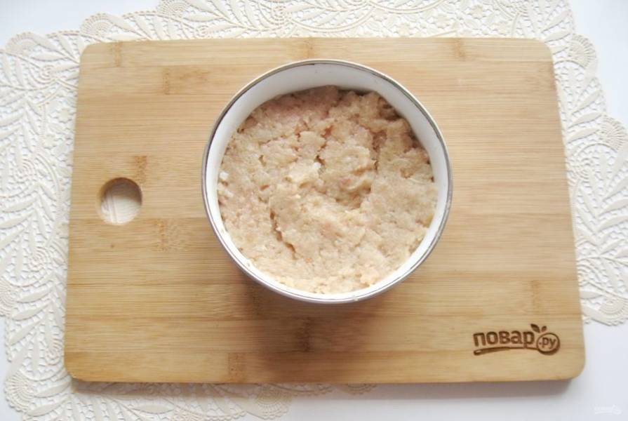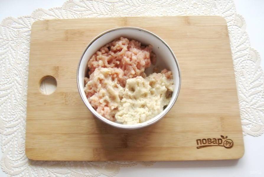 Приготовьте фарш для фрикаделек. Куриное филе помойте, булку замочите в холодной воде, а через пять минут отожмите. Половинку луковицы, филе и булку пропустите через мясорубку.