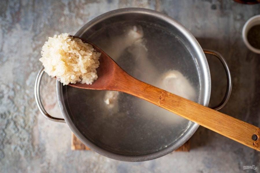 Рис промойте в холодной воде и добавьте в кастрюлю с куриным бульоном. Варите 15 минут. Из кастрюли при желании вы можете достать куриные окорочка и выложить их на тарелку.