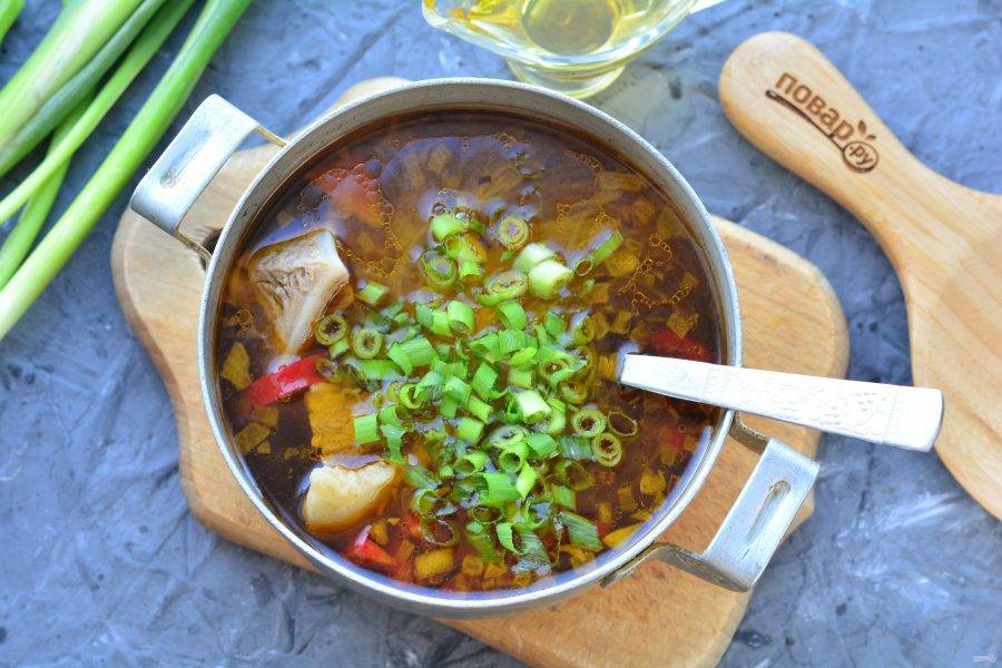 Нарежьте мелко зеленый лук и всыпьте в суп. Выключите огонь, суп готов. Дайте настояться 5-7 минут.
