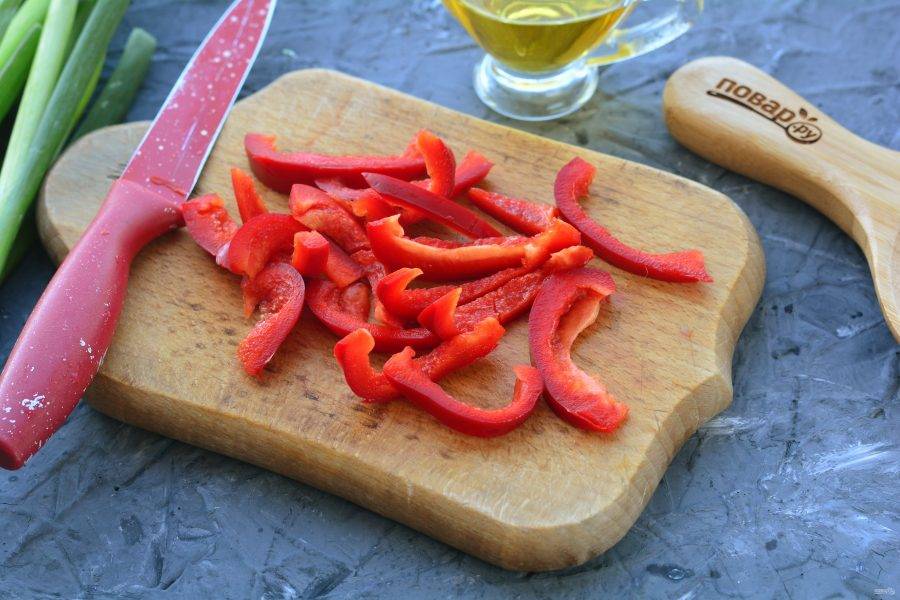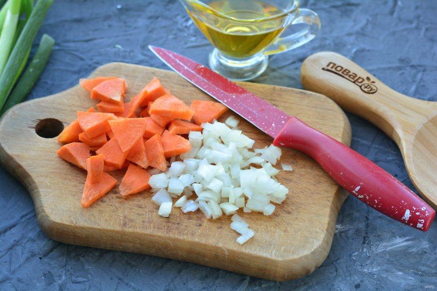 Почистите лук и морковку, нарежьте овощи, лук мелкими кубиками, морковку средними ломтиками.