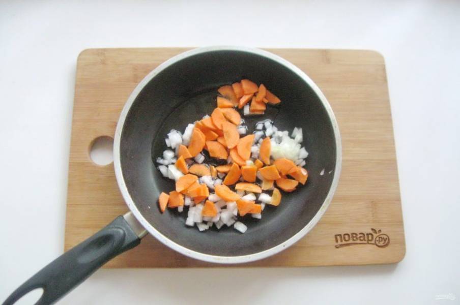 Морковь и лук нарежьте некрупно и выложите в сковороду.