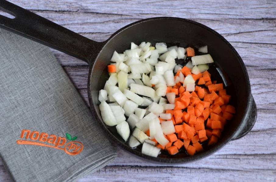 3. Порежьте лук и морковь, обжарьте на масле до готовности.
