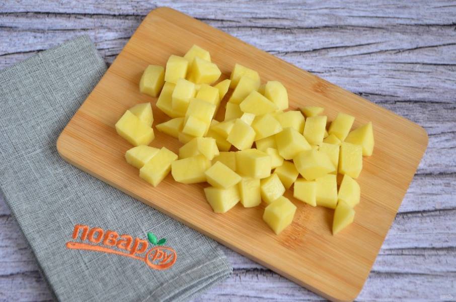 4. Порежьте картофель кубиками, положите в бульон и варите 10-15 минут.