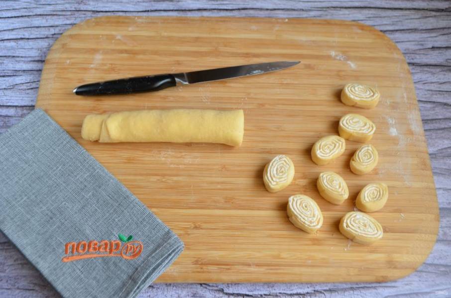10. Сверните тесто с сыром в плотный рулетик, скрепите края, нарежьте рулет на кусочки - маленькие рулетики.