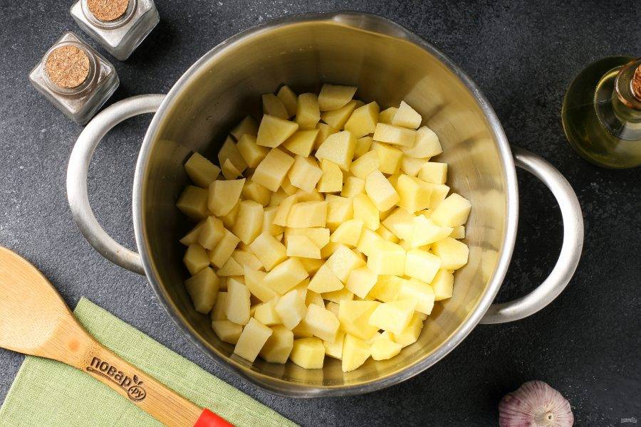 Картофель нарежьте кубиками и переложите в кастрюлю.
