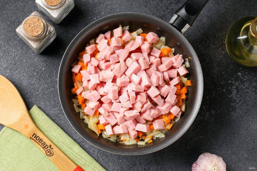 Добавьте нарезанную кубиками ветчину, у меня куриная, но можно взять другую или вовсе заменить её на любые колбасные изделия.