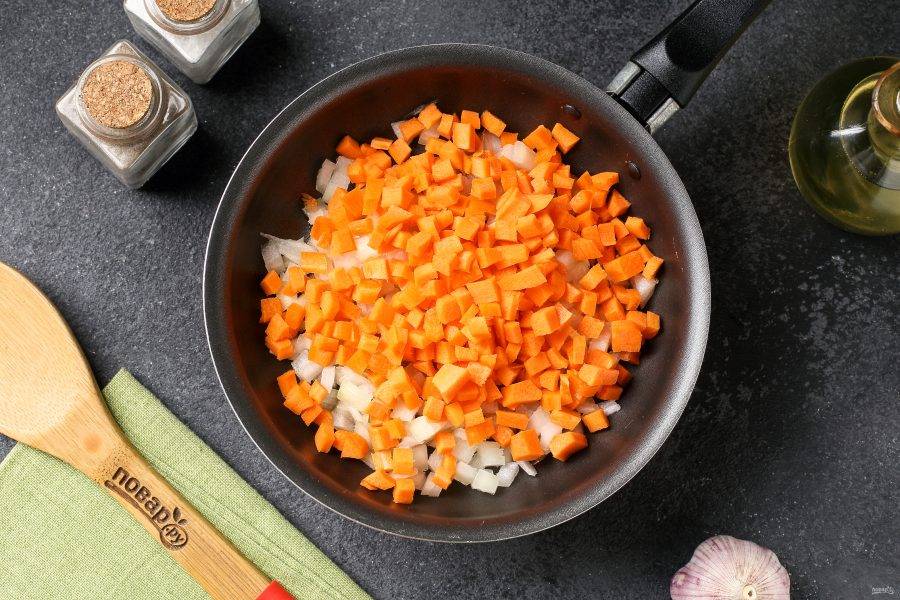 Лук и морковь нарежьте кубиками. Выложите в разогретую сковороду с маслом и обжарьте в течение 3-5 минут.