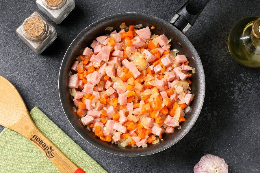 Обжарьте ветчину с овощами в течение 3 минут. Затем отправьте содержимое сковороды в кастрюлю.
