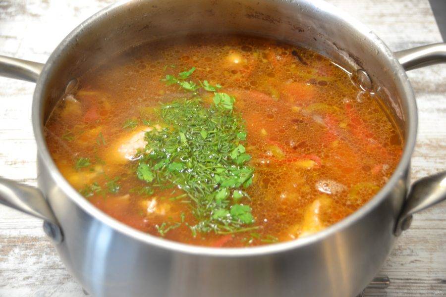После того, как суп снова закипит, добавьте лавровый лист, измельченный чеснок, зелень и снимите с огня.