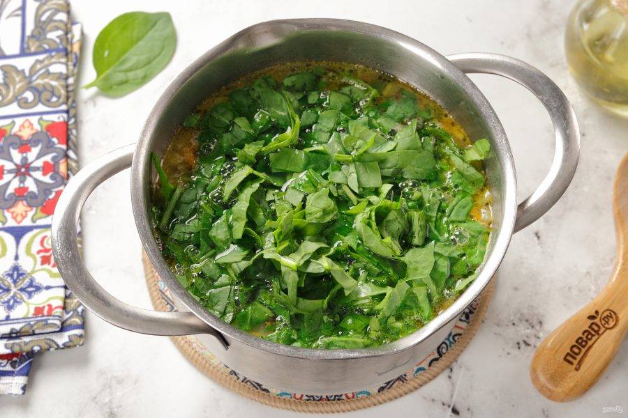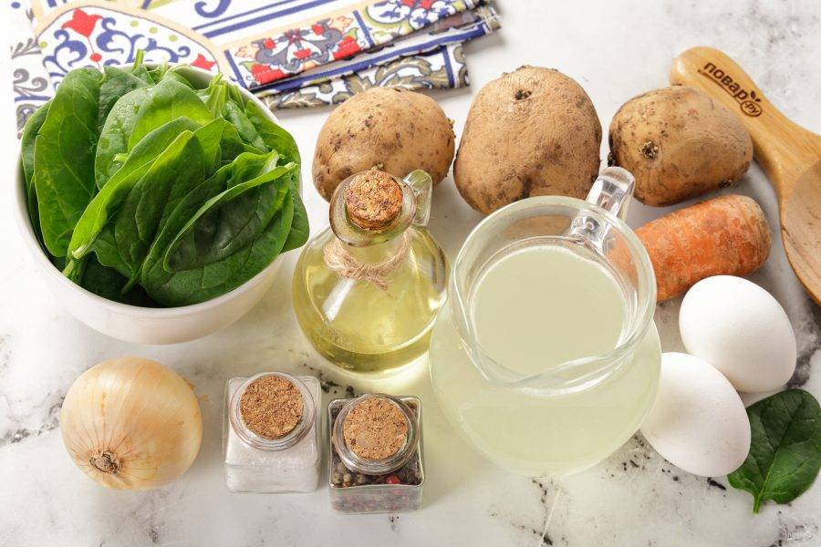 Подготовьте все ингредиенты по списку. Я буду готовить на курином бульоне, вы можете заменить его любым другим или взять воду. Шпинат промойте и обсушите.