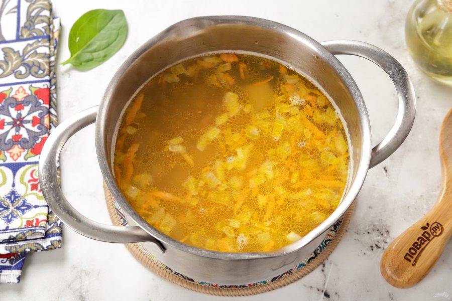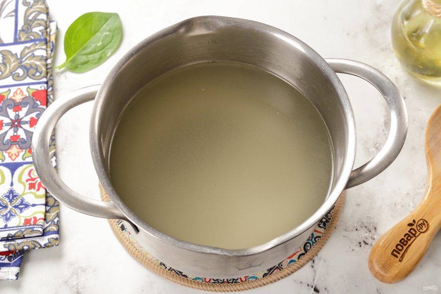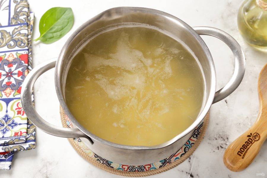 Налейте бульон в кастрюлю и поставьте на огонь. Доведите до кипения.