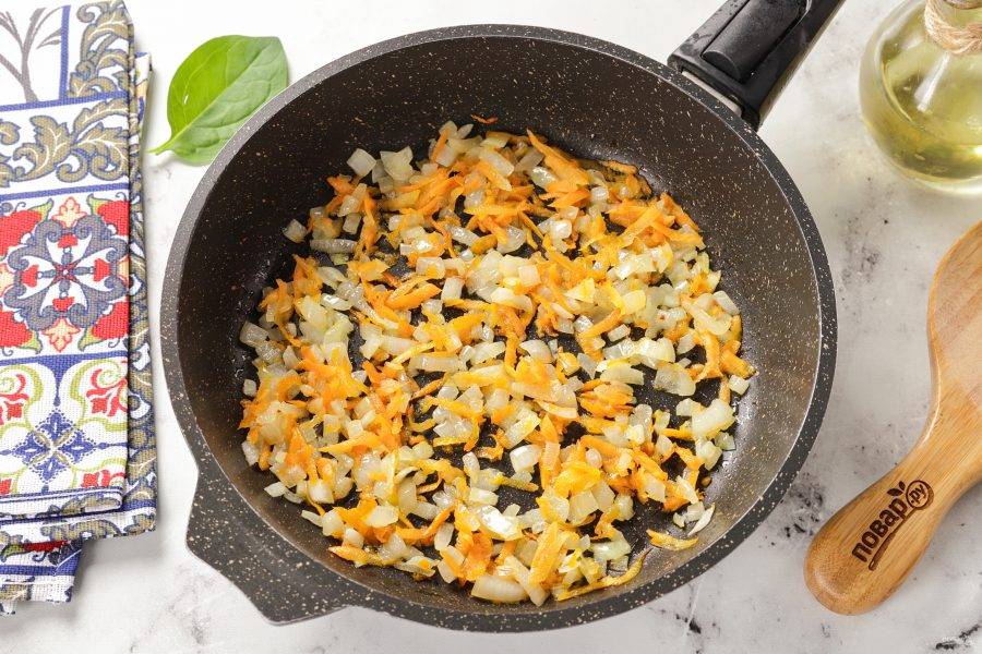 Пока варится картофель, разогрейте сковороду с маслом. Выложите нарезанный кубиками лук и тёртую морковь.