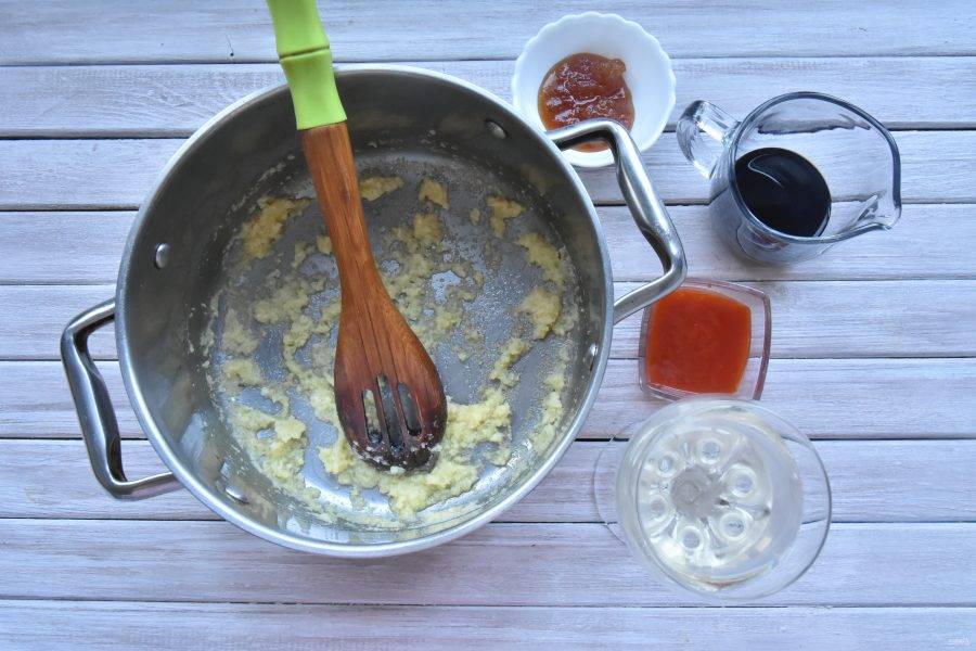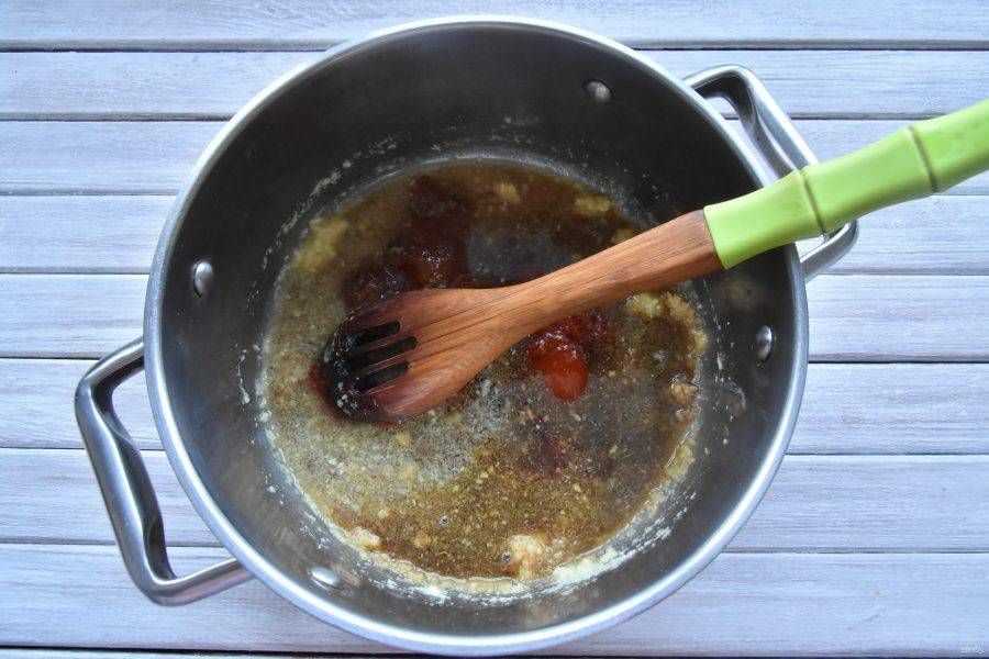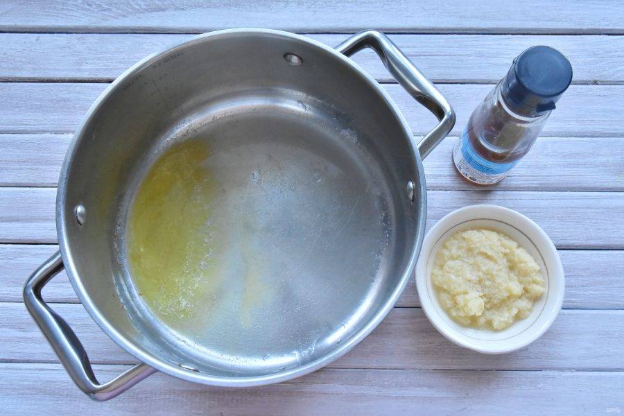 Добавьте в растопленное масло пасту из измельченного чеснока и имбиря. Прогрейте смесь на среднем огне.