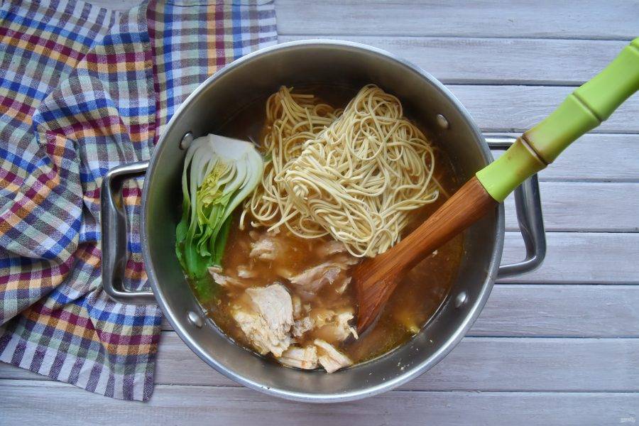 В кастрюлю с бульоном выложите пшеничную лапшу и половинки пак чой. На медленном огне доведите лапшу до готовности (3 минуты) и снимите кастрюлю с огня.