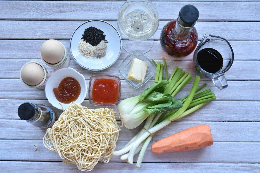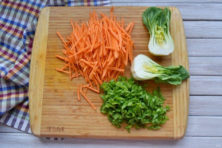 Морковь нарежьте тонкой соломкой. Пак чой разрежьте вдоль пополам. Зеленый лук нарежьте. Сварите яйца вкрутую (3-5 минут).
