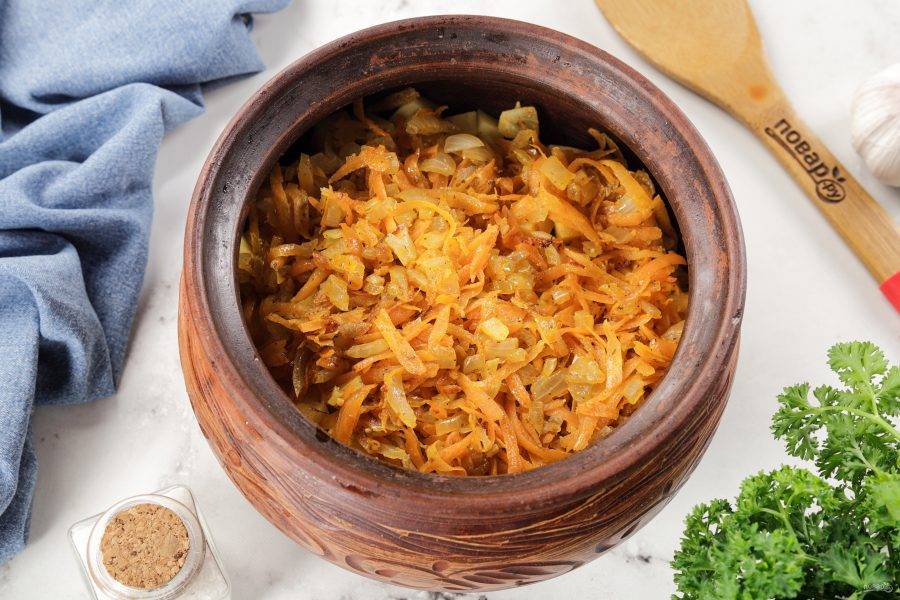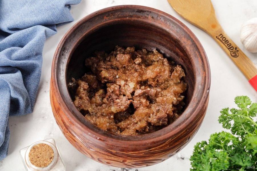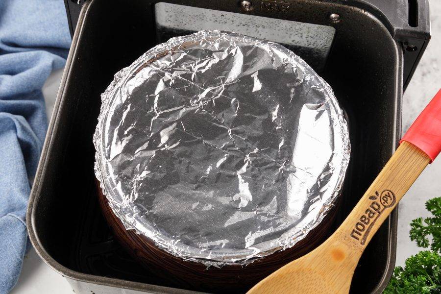 Накройте горшочек или кастрюлю фольгой. Я готовлю при температуре 200 градусов 1 час 30 минут.
