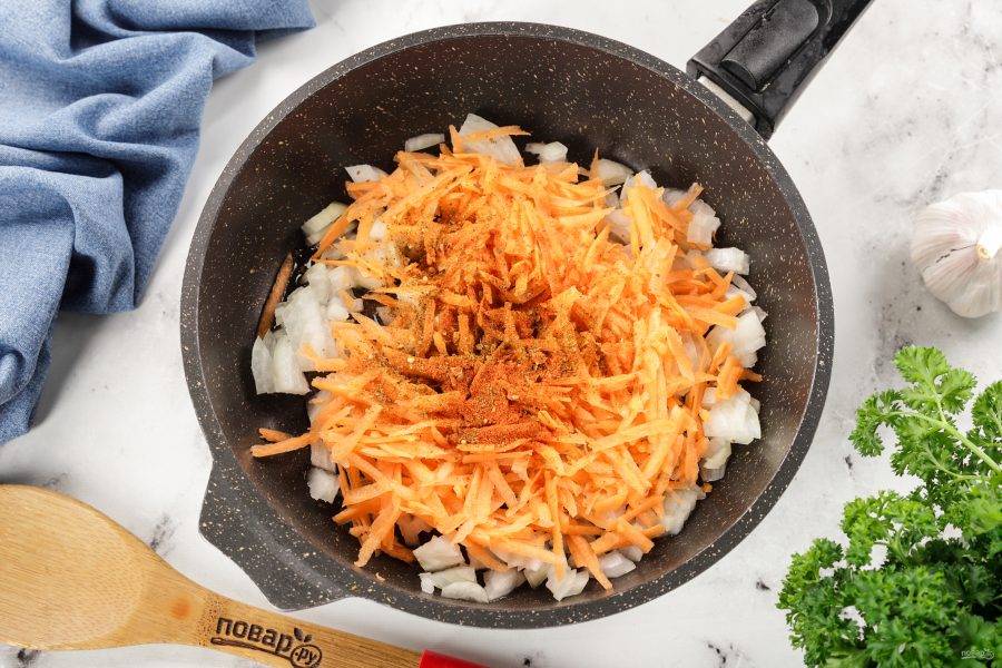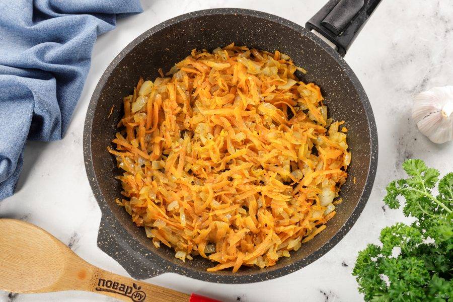 Разогрейте сковороду с маслом. Выложите тёртую морковь и нарезанный кубиками лук.