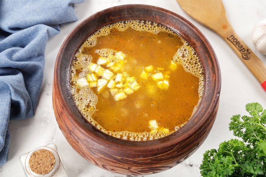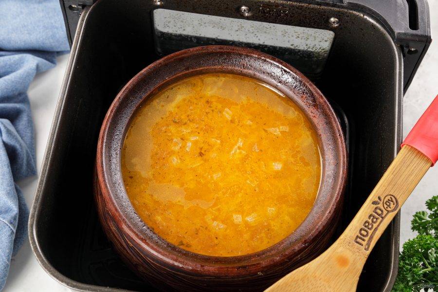 Налейте кипяток и добавьте измельчённый ножом чеснок. Количество воды зависит от желаемой густоты супа и объёма вашей посуды для аэрогриля.