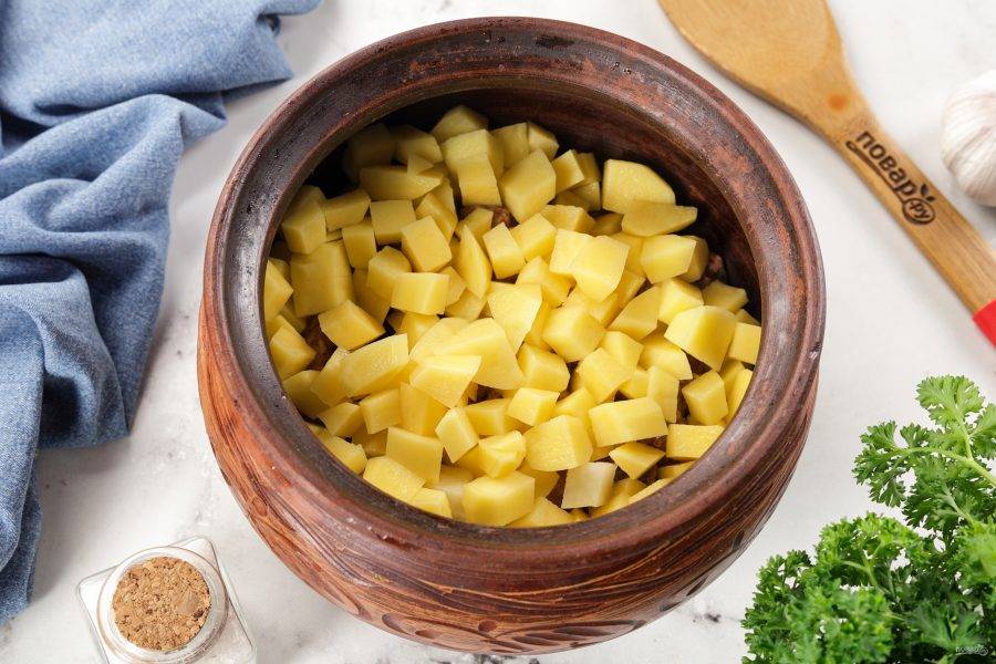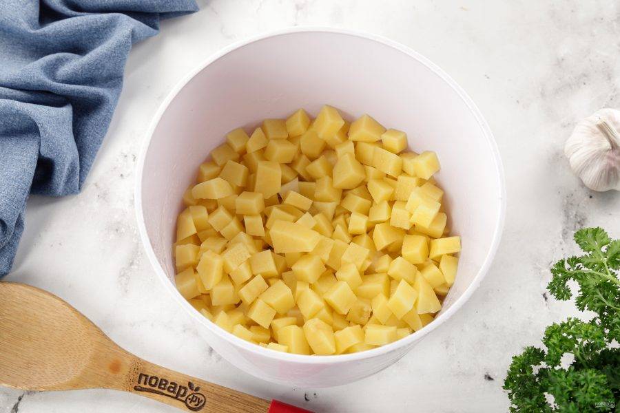 Сверху выложите нарезанный небольшими кубиками картофель.