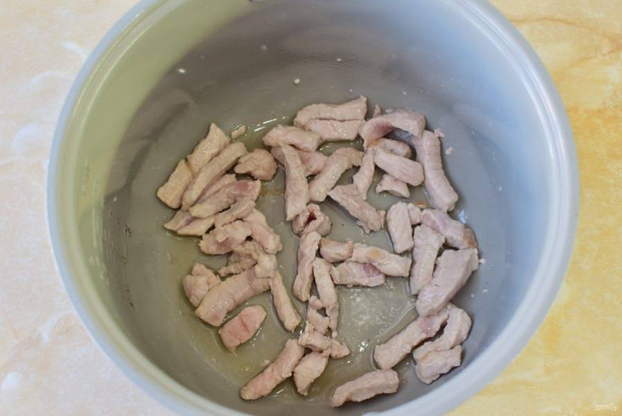 Скороварку разогрейте до горячего состояния и налейте в неё немного растительного масла. Обжарьте мясо 7-10 минут, чтобы оно изменило цвет.