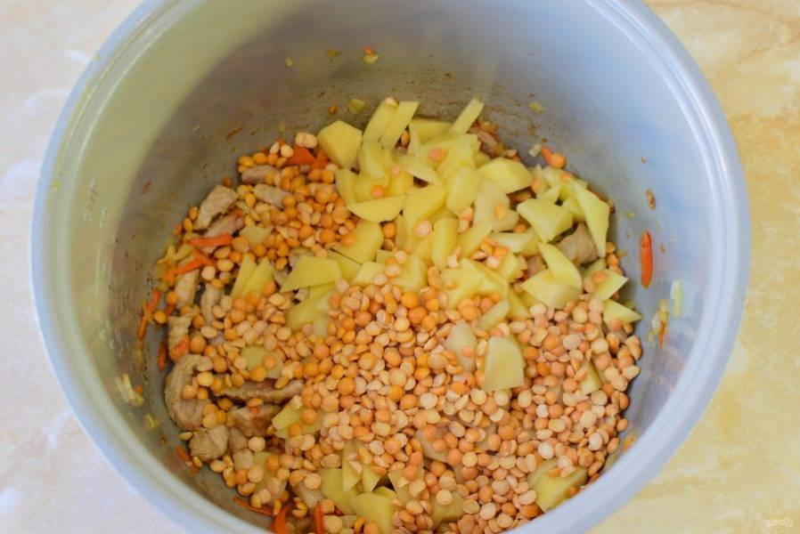 В чашу добавьте горох и картофель.