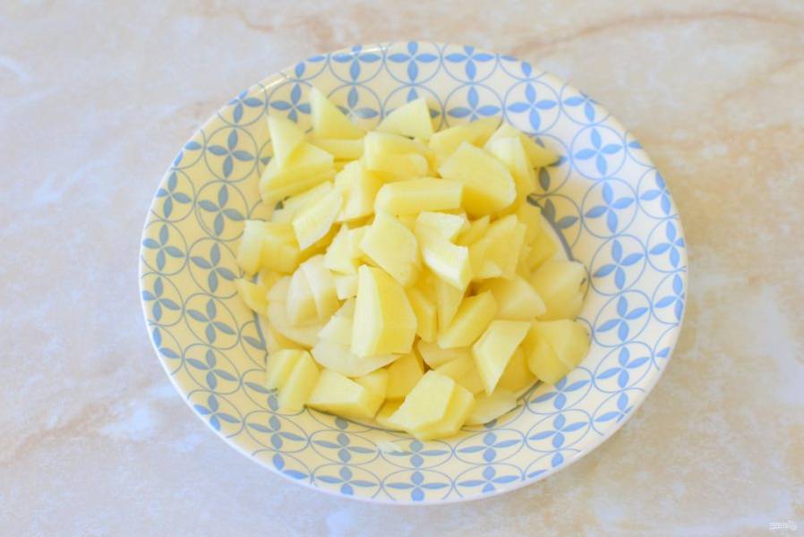 Картофель очистите и нарежьте на кусочки.