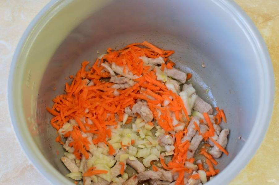 Лук и морковь очистите от кожуры, ополосните и измельчите. Лук мелко нарежьте, а морковь потрите на терке. Добавьте овощи в чашу к мясу. Перемешайте. Обжарьте еще 2-3 минуты.