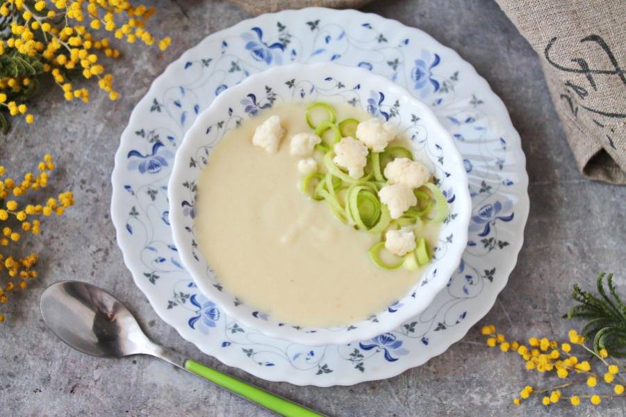 Медленно вливайте в кастрюлю бульон, все время мешая. Добавьте в суп соцветия цветной капусты.