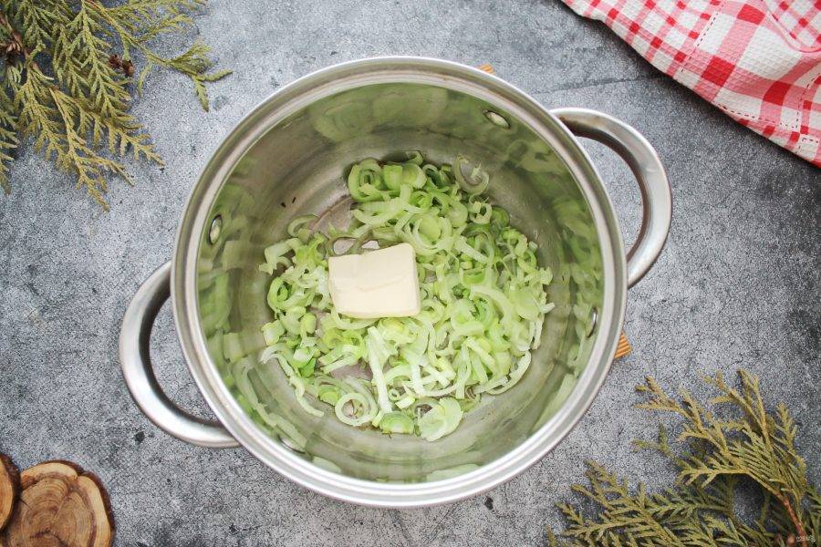 Порей порежьте полукольцами и выложите в кастрюлю с толстым дном. Добавьте к нему сливочное масло и поставьте на средний огонь. Дайте маслу растаять и готовьте лук в течение 3 минут, перемешивая.