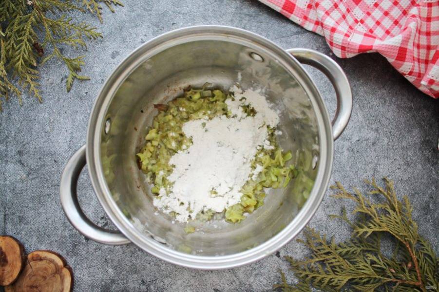 Добавьте к луку порею муку, мешая, обжаривайте все еще 3 минуты.
