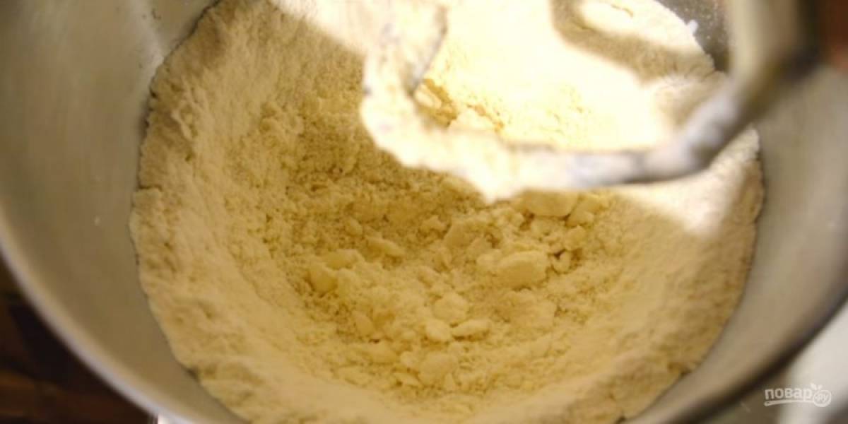 2. Холодное сливочное масло перетрите в крошку с просеянной мукой. Яичную массу смешайте с дрожжевой массой и добавьте к песочной крошке. Замесите мягкое тесто, оно не должно липнуть к рукам.