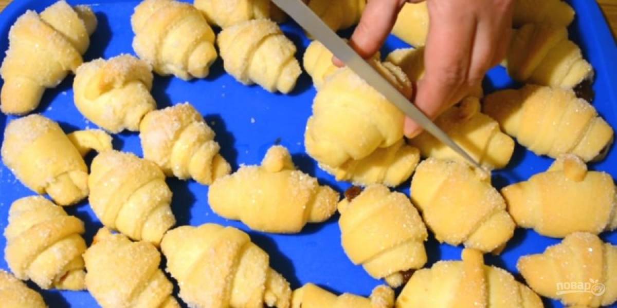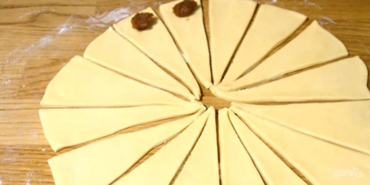 4. Разрежьте круг на 16 или меньше треугольников – в зависимости от размеров будущих рогаликов. На край пошире выложите начинку и сверните рулетом к узкому краю. Рогалики смажьте взболтанным яйцом или просто обваляйте в сахаре.
