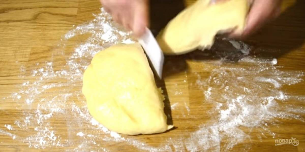 3. Слегка вымесите тесто, соберите его в ком и заверните в пленку. Оставьте тесто на столе на 1 час, оно не должно подняться. Разделите тесто на две части, каждую раскатайте в круг толщиной примерно 3 мм.