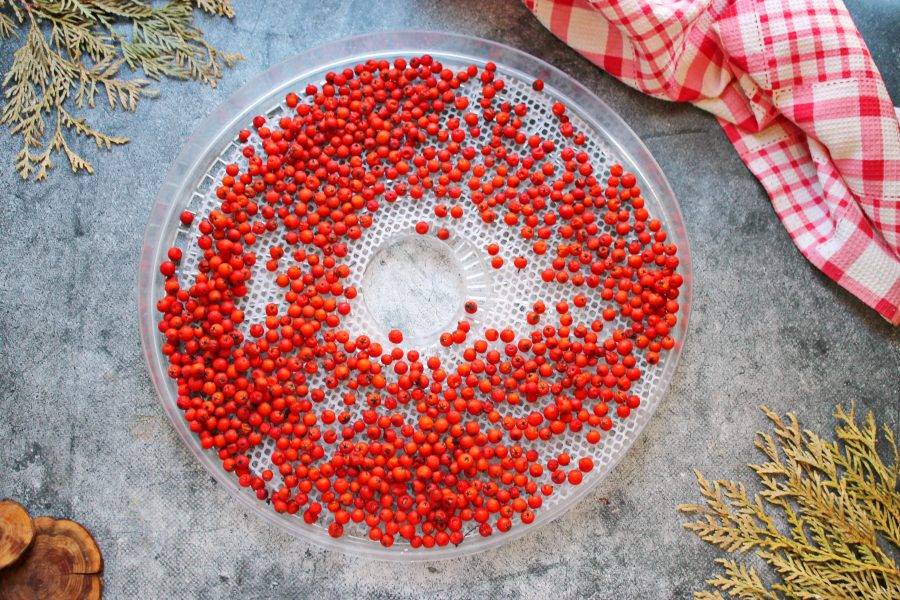 Ягоды отделите от веточек, переберите и сполосните. Откиньте ягоды на сито и дайте полностью стечь воде. Разложите ягоды на полотенце и дайте им полностью высохнуть. Разложите рябину тонким слоем на решетке для электросушилки с сеткой для ягод или пергаменте.