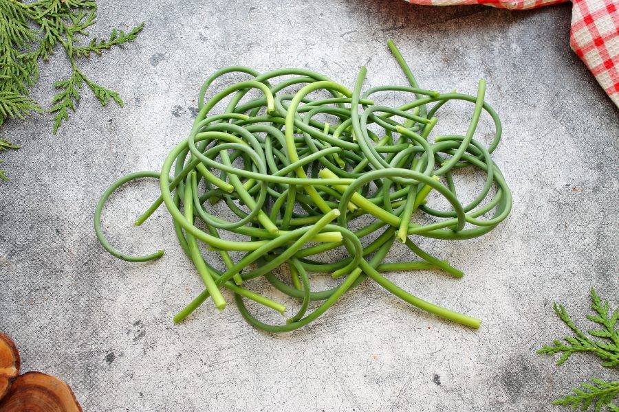 У чесночных стрелок отрежьте бульбочки, они нам не потребуются.