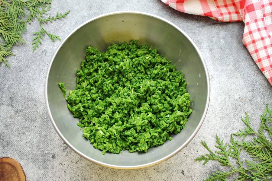 Прокрутите чесночные стрелки через мясорубку с мелкой решеткой.