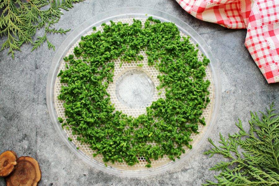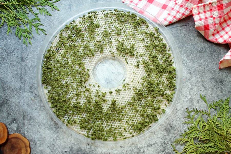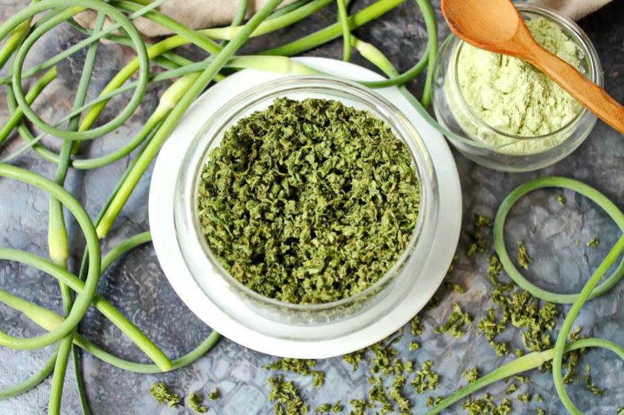 Установите поддоны с чесночной стрелкой в электросушилку и включите прибор. Сушите массу в течение 6-8 часов при температуре 70 градусов. Готовую массу остудите и уберите на хранение.