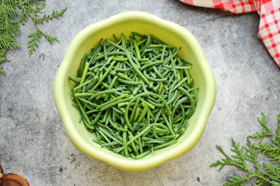 Подготовьте чесночные стрелки для приготовления. Стрелки переберите, удаляя порченые или жесткие, сполосните и полностью обсушите.