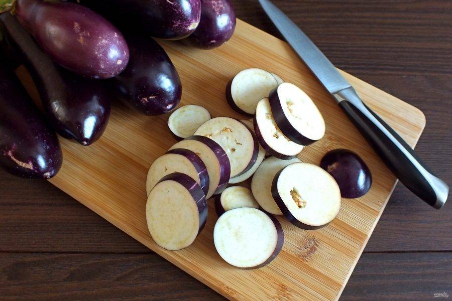 Баклажаны вымойте, обсушите. Нарежьте кругляшками, толщиной в пределах 1 см.