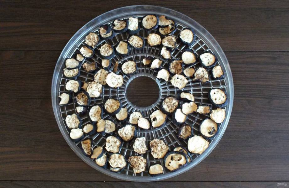 Возьмите секцию от электросушилки и разложите баклажаны. Закройте сушилку крышкой. Сушите при температуре 45-50 градусов в течение 8-10 часов.