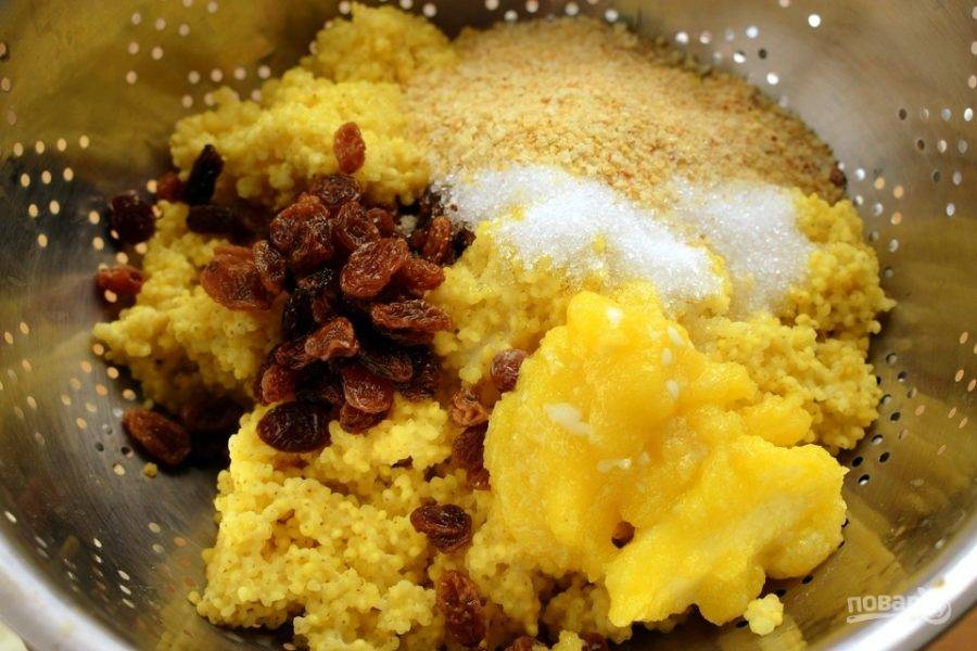 Добавьте изюм, сахар, молотые сухари, растопленное сливочное масло и тщательно перемешайте.