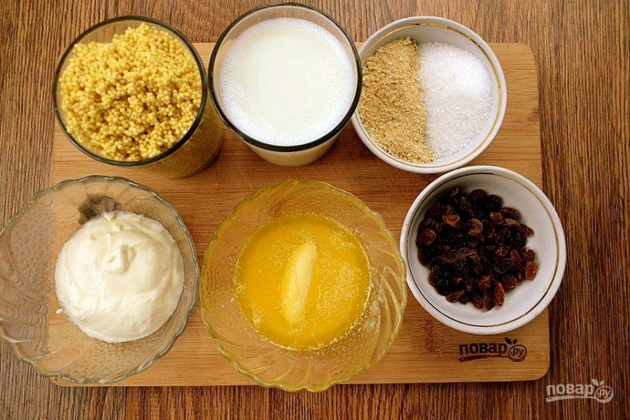 Подготовьте необходимые продукты. Пшено промойте теплой водой, залейте теплой водой на 15 минут, слейте воду.