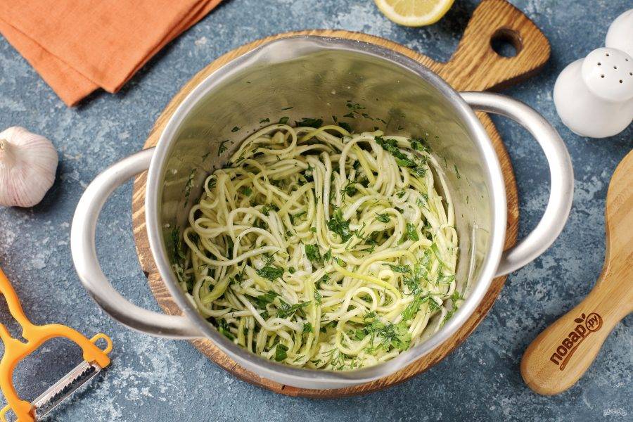 Соедините кабачки, сок лимона, соль, сахар, измельчённую зелень и давленый чеснок.