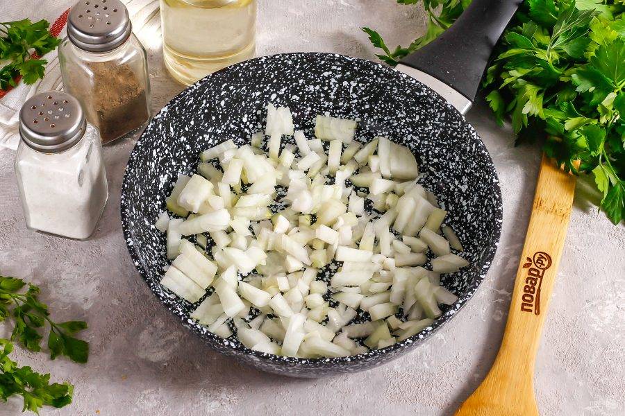 Нарежьте луковицы мелкими кубиками и отпассеруйте нарезку примерно 4-5 минут до румяности в растительном масле. Немного масла оставьте для смазывания формы.