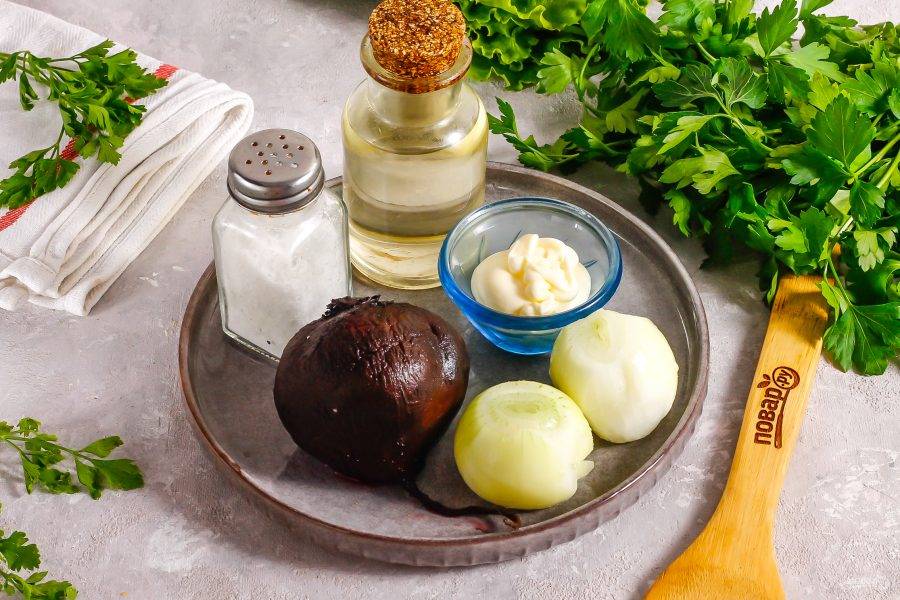 Подготовьте указанные ингредиенты. Заранее отварите свеклу примерно 30 минут и остудите в ледяной воде. Можно использовать несколько корнеплодов, если у вас большая семья. Лук очистите от кожуры и промойте.