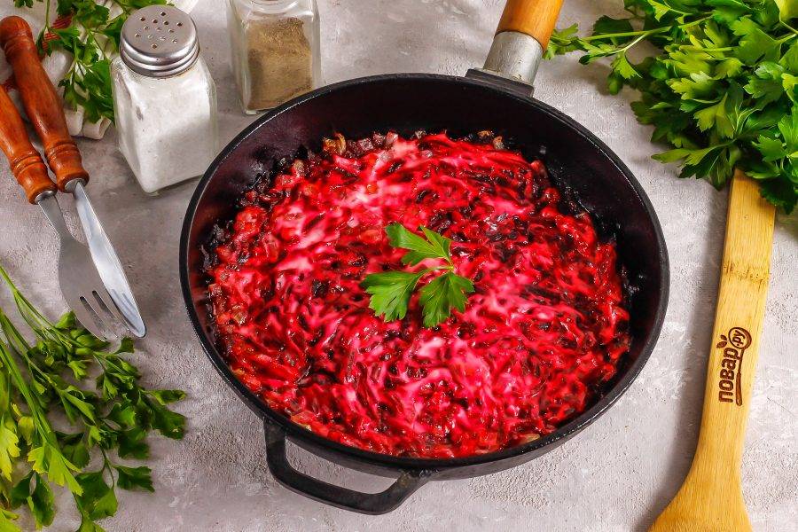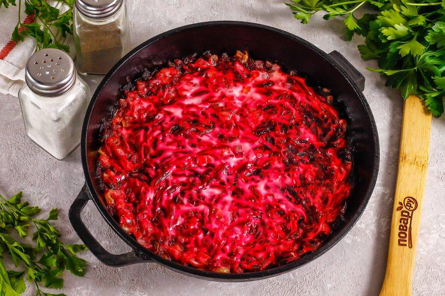 Обжаренный лук перемешайте с натертой свеклой, всыпав туда же соль. Можно добавить овощную приправу вместо соли, блюдо станет еще вкуснее.